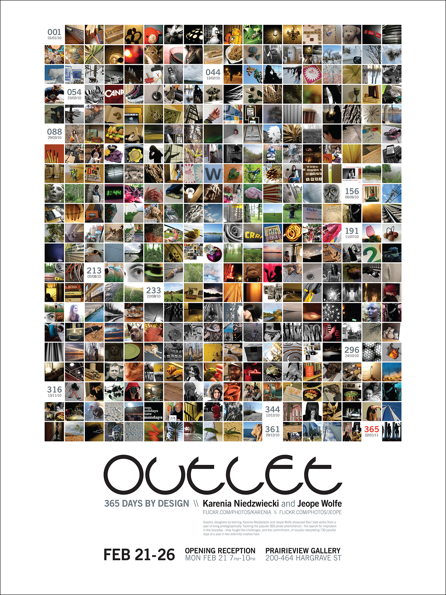 In 2010, I completed a 365 photo project, in which I took one photo a day for a whole year (not on my cellphone!). Having completed the same project, my friend Jeope Wolfe and I teamed up to plan and design a gallery show to present our best shots from the year. We called it Outlet, 365 days by design and it ran from February 21-26, 2011 at the PrairieView Gallery. These are some of the photographs that I selected to display at our show, along with our promotional poster.